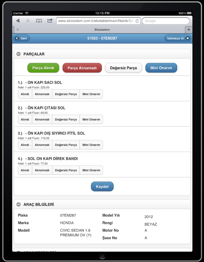 Sürecin en önemli parçasını oluşturan sahada(servis, ÖTA toplama, bayi noktaları) Hurda Parça Takip Sistemi yazılımının daha rahat kullanılabilinmesi, veri alışverişinin sağlanması amacı ile tablet modülümüz kullanılmaktadır. İadecilerin servislerde parçaları toplaması, merkeze verileri anlık iletmesi ve merkez-iadeci arasında iletişimin sistem aracılığı ile yapılması sürecinde tablet modülü çok büyük önem kazanmaktadır.