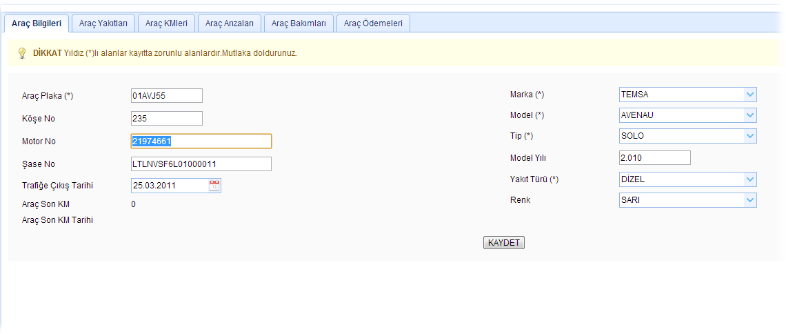 Araç resmi dahil olmak üzere, şase no, motor no, trafiğe çıkış tarihi gibi detay bilgiler ile her bir araç için bir kart oluşturulmaktadır. Oluşturulan bu kartların yardımı ile araçların tüm detaylarının raporlanması sağlanmaktadır.