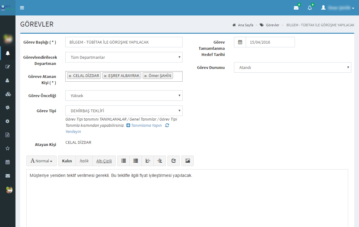 Bir personele ne göre verildi ve hangi müşteri ile ne zaman görüşme yapılacak sorusuna yanıt arıyorsaınz çözüm burada. Görev ataması yapabileceğiniz gibi görevleri takip edebilirsiniz. Ayrıca ajanda yapısı ile toplantılarınızın ne zaman olduğunu takip edin. Sistem ajandanızdaki bir görevin zamanı geldiğinde sizi uyaracaktır.