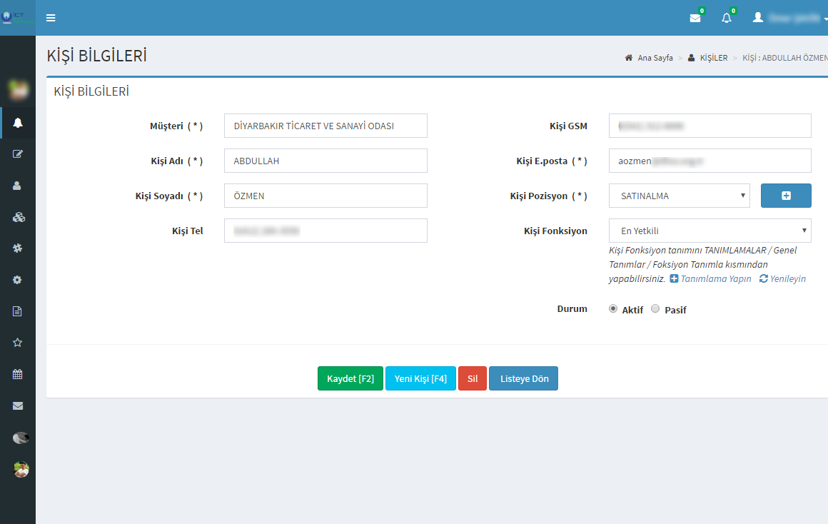 Müşterilerinize ait irtibatta olduğunuz kişi bilgilerini buradan takip edebilirsiniz. Eğer bizim tanımladığımız alanlar sizin için yeterli değil ise yönetim panelinden dinamik olarak yeni alanlar ekleyebilirsiniz.