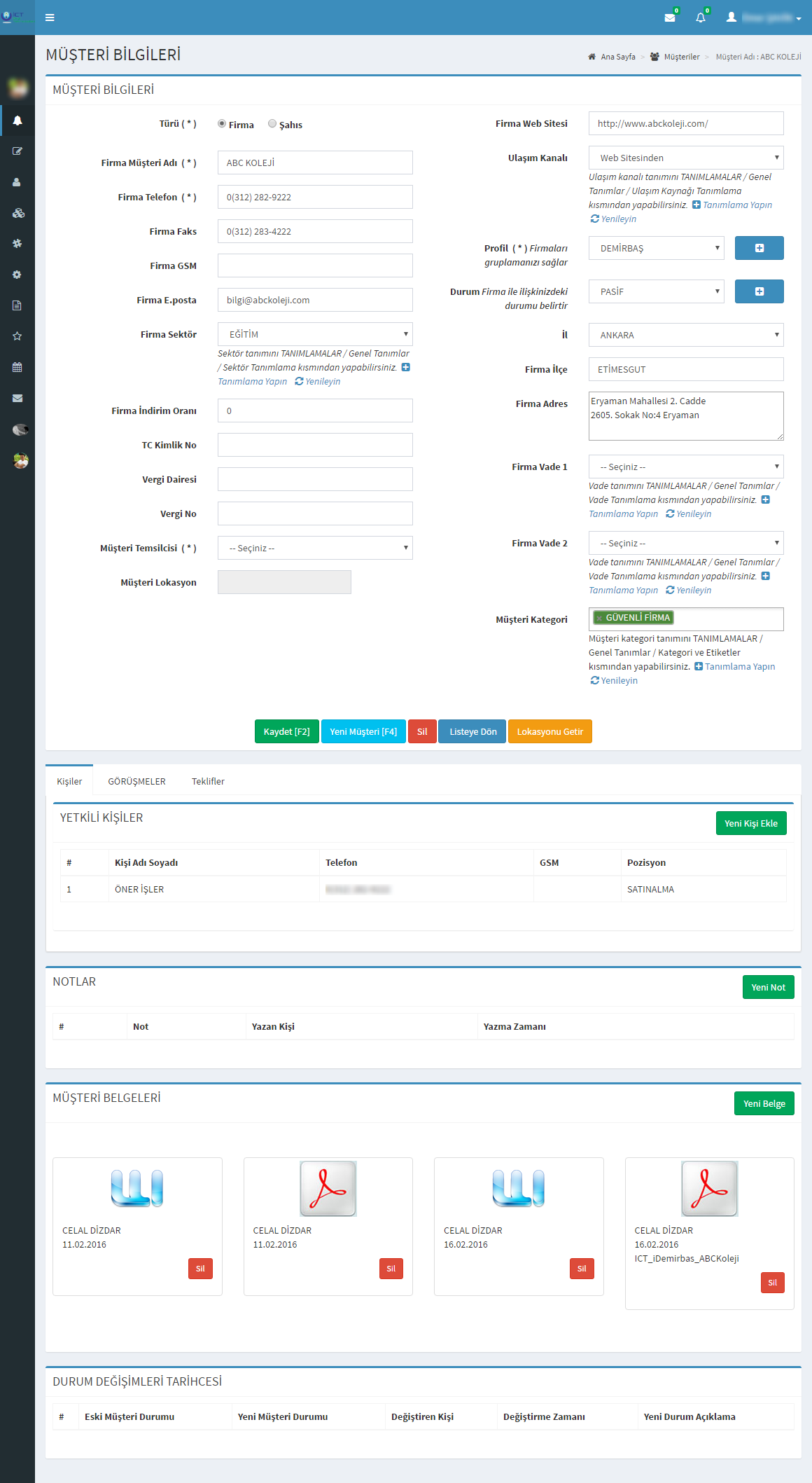 Müşterilerinize ait tüm bilgilere bu ekrandan ulaşabilirsiniz. Müşterinize ait tüm bilgilerin girişini yapabileceğiniz gibi bu sayfadan müşterinizle yaptığınız görüşmelerinize, müşteri hakkındaki notlarınıza, müşteri belgelerine ve müşteri durum değişim tarihçesine ulaşabilirsiniz. Eğer bizim tanımladığımız alanlar sizin için yeterli değil ise yönetim panelinden dinamik olarak yeni alanlar ekleyebilirsiniz.