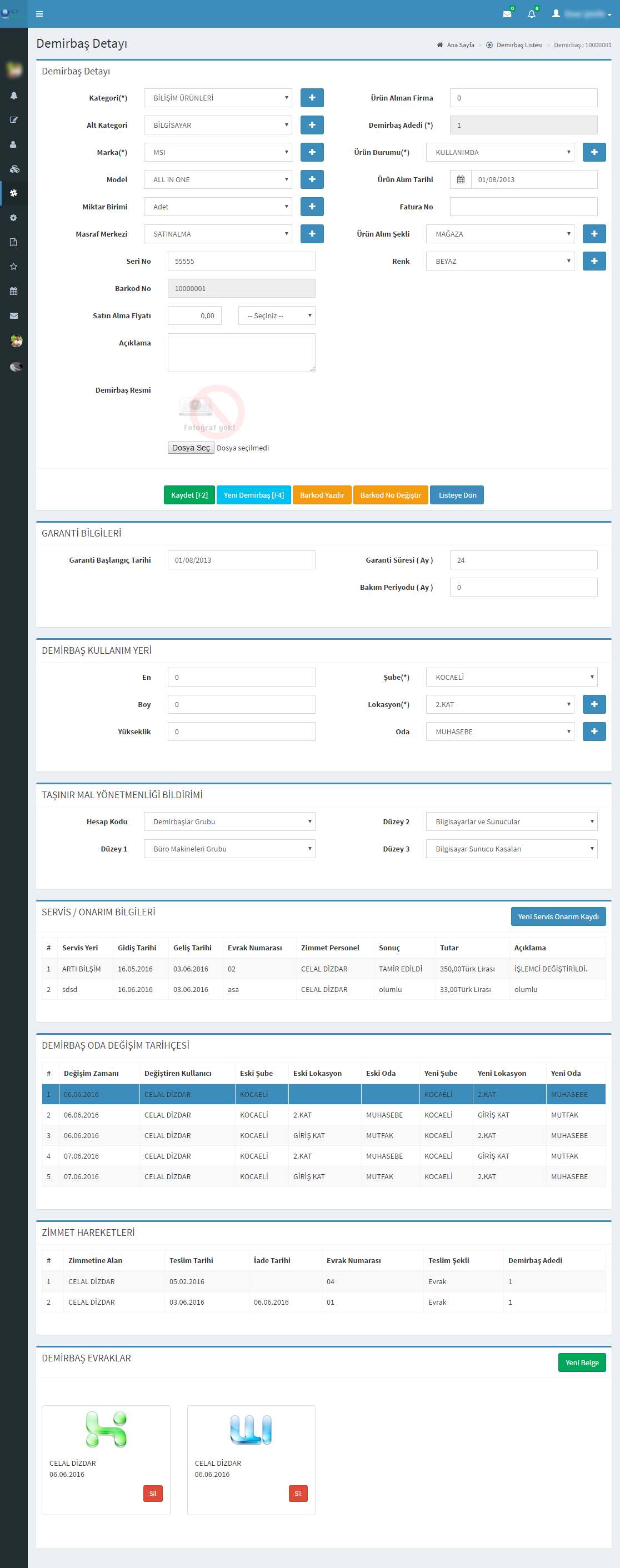 Demirbaş Yönetimi ile tüm demirbaşlarınızın bilgilerini kayıt altında tutarsınız. Demirbaşa ait zimmet kayıtlarını, garanti, servsi-onarım bilgilerini takip edebilirsiniz. Ayrıca demirbaşlarınızın sayımlarını yapabilirsiniz.
