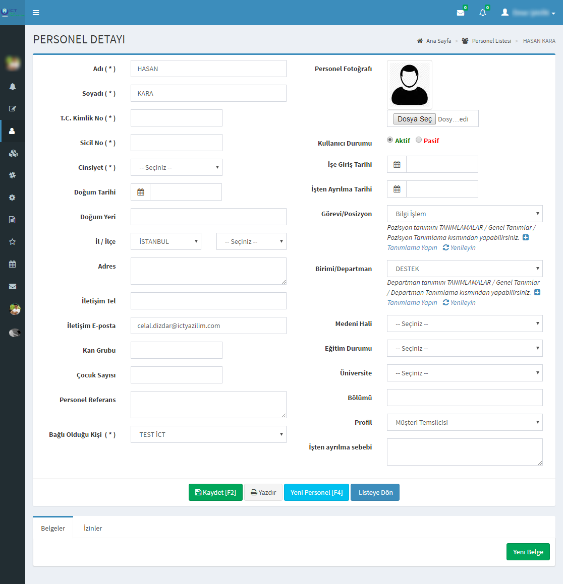 Personele ait detaylı özlük bilgilerini kayıt altına alıp daha sonra heryerden ulaşabilirsiniz. Ayrıca personele ait belge ve izin kayıtlarına buradan erişebilirsiniz.